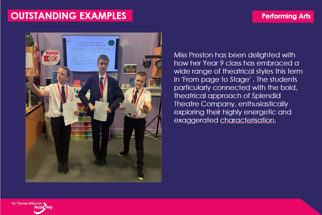 The structure of the curriculum is based on a spiral progression of learning. Through the recursive nature of the subject, pupils will re-visit the skills and techniques via different genres, texts and styles of performance, constantly building upon and developing their knowledge and understanding of performance. They will regularly explore how to creatively demonstrate; voice, physicality and audience awareness to present a role. The practice of critical self and peer reflection is embedded through the learning experience.