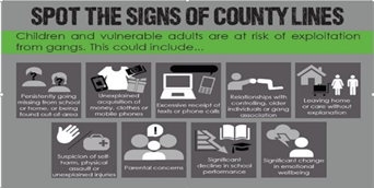 County Lines (Child Criminal Exploitation), is a form of criminal exploitation where highly organised criminal networks coerce or force children and young people into storing drugs or money and/or transporting them to other areas. The county lines gangs use sophisticated methods to groom young people into criminal activity and often trick them into a debt bondage which they then have to pay off.  It is not uncommon for threats of violence against the young person and/or their family to be made of they do not comply. The illustration below outlines some of the signs that a child or young person might be at risk of exploitation: