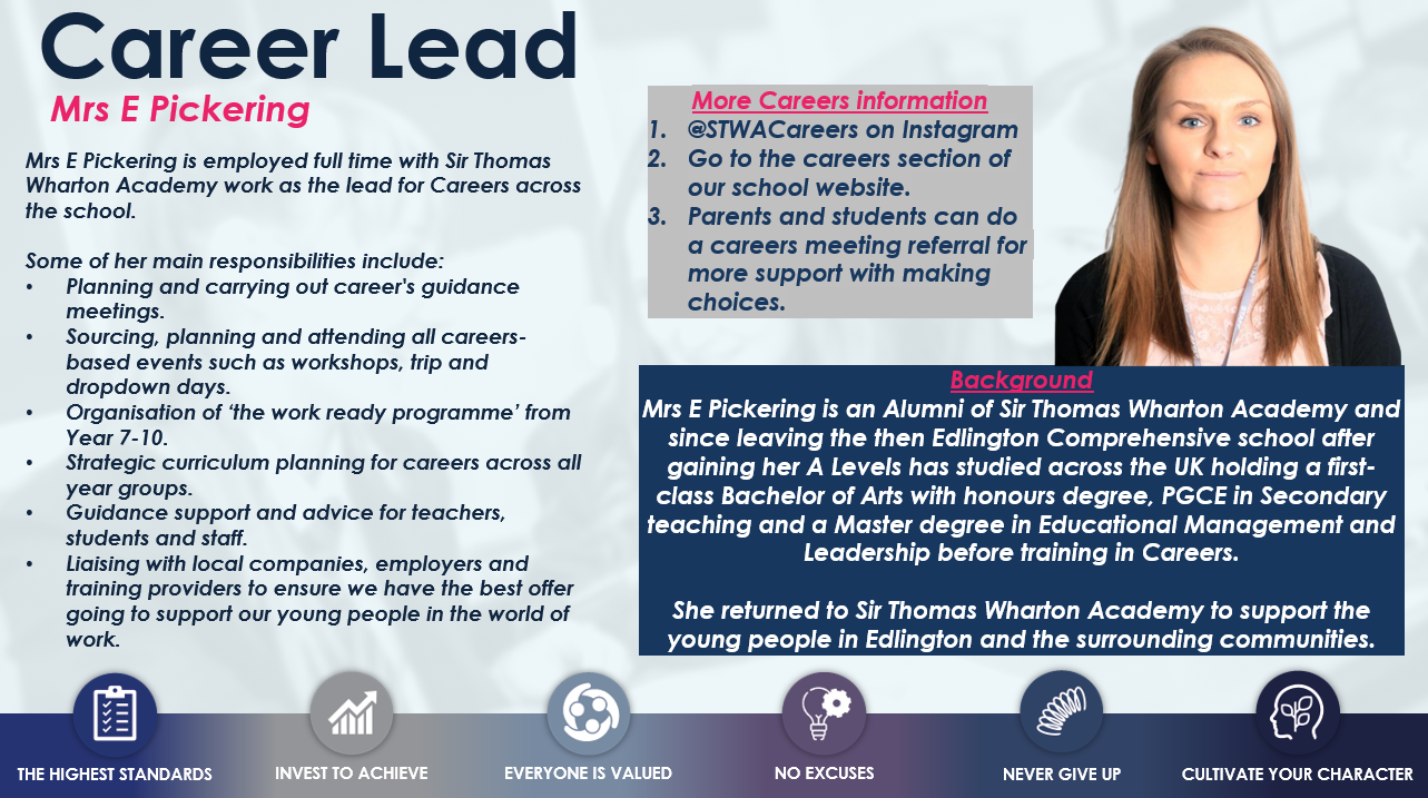 - To ensure that all students experience at least four high-quality career interactions during their career at Sir Thomas Wharton Academy