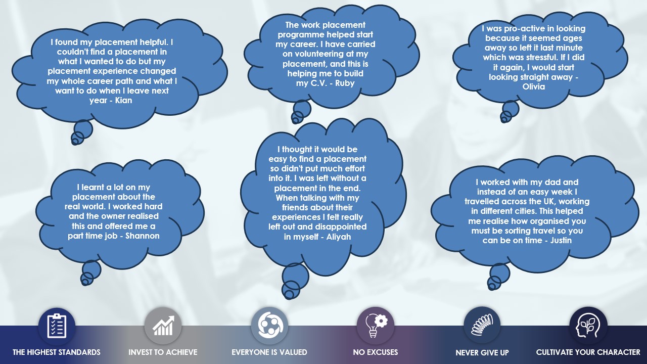 At Sir Thomas Wharton we don't just provide a work placement we offer a programme packed with different topics to make sure students are prepared for the world of modern work from understanding the 4 best ways to contact employers and how to conduct themselves to CV writing as well as practical experience of different types of interviews used in todays workplaces.