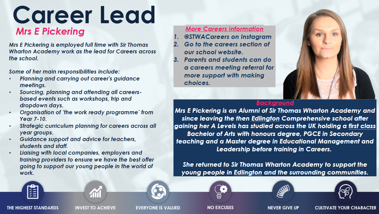 - To ensure that all students experience at least four high quality careers interactions during their career at Sir Thomas Wharton Academy